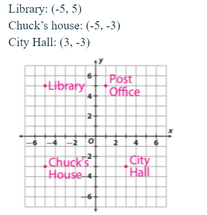 Chuck decides to add the post office to the map. The post office is 6 blocks east of the library. What are te coordinates ot the post office?