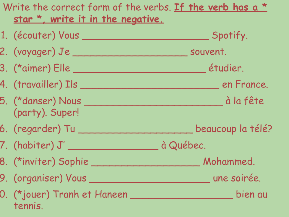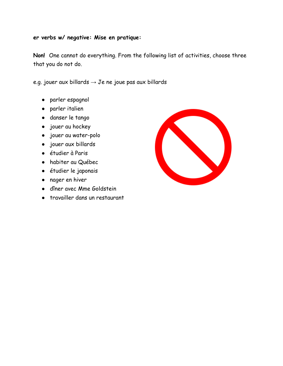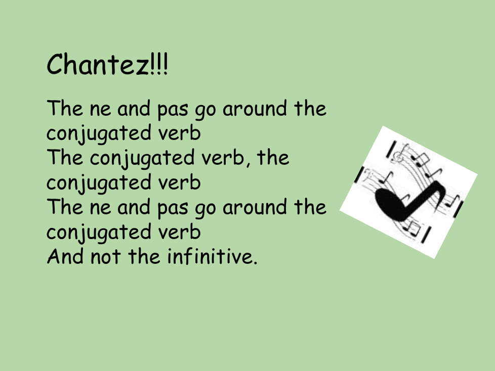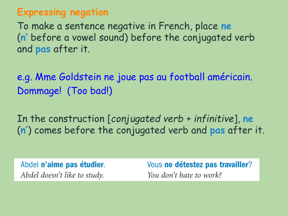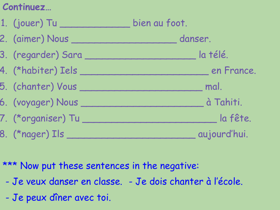 Now put these sentences in the negative: Je veux danser en classe./Je dois chanter à l'école./Je peux dîner avec toi.