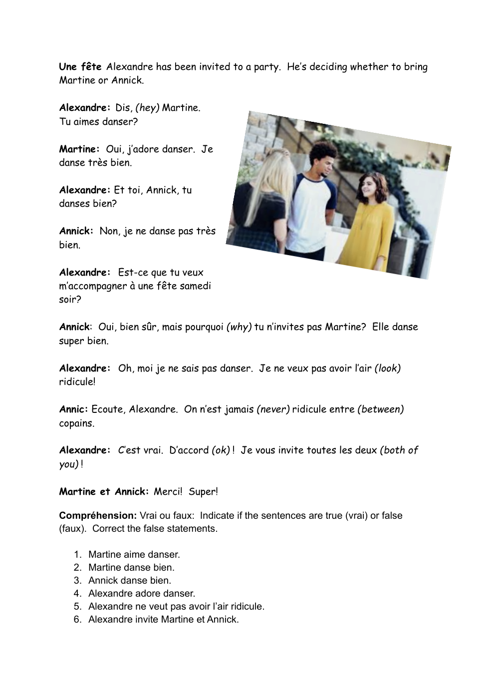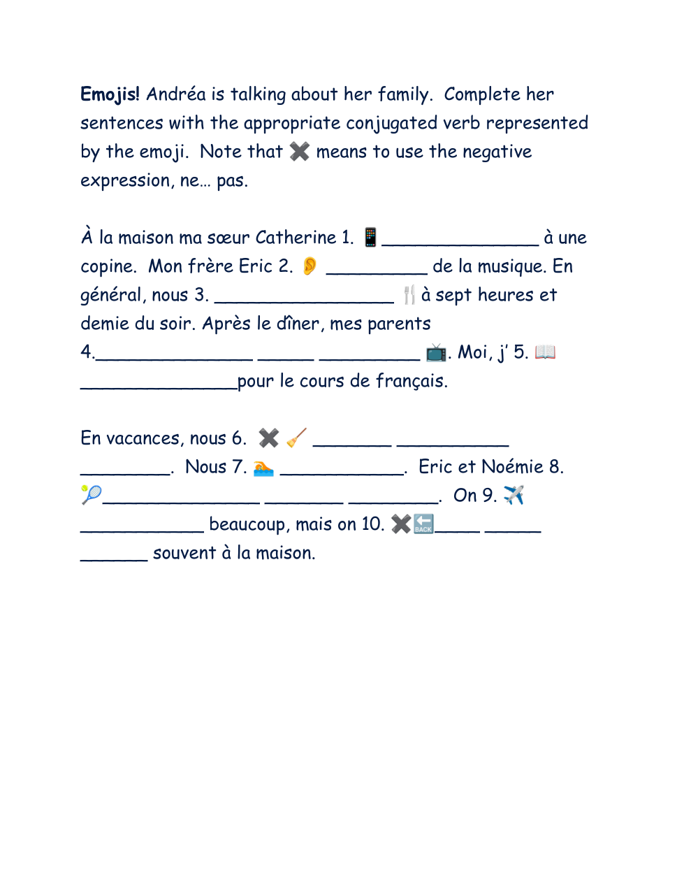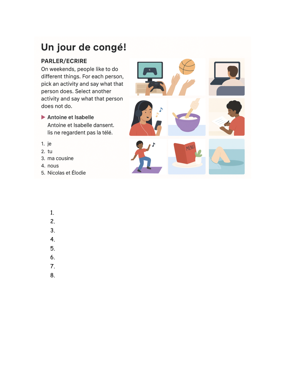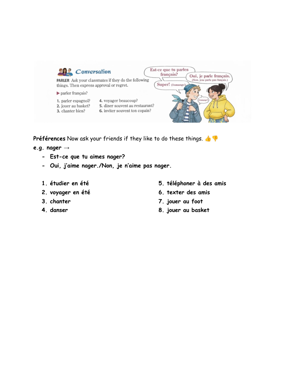 Now put these sentences in the negative: Je veux danser en classe./Je dois chanter à l'école./Je peux dîner avec toi.
