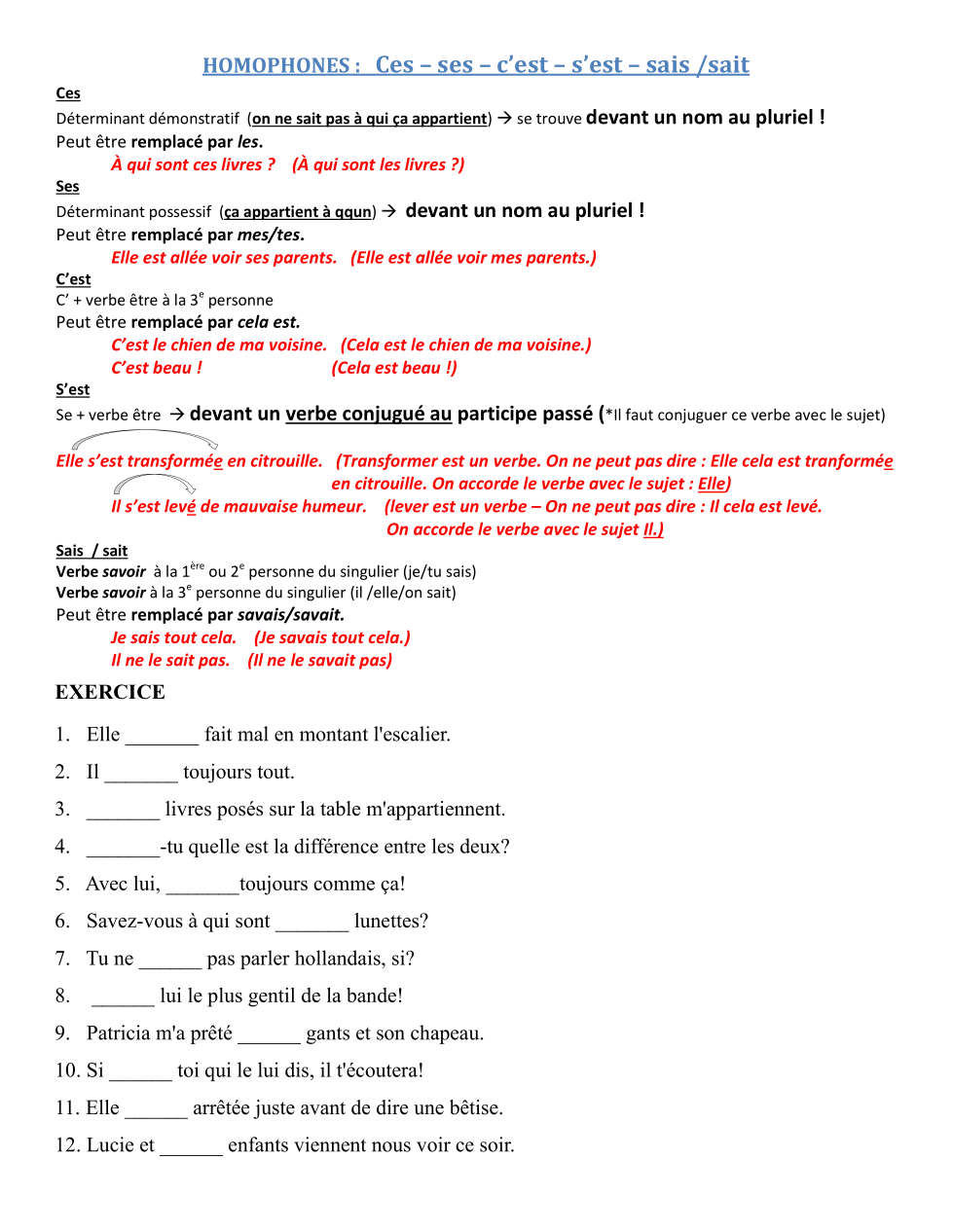 Maintenant que tu maitrises mieux les homophones ses-ces-sait-sais-c'est-s'est, consolide tes apprentissages en réalisant l'exercice suivant.