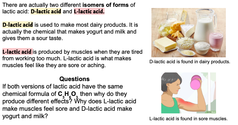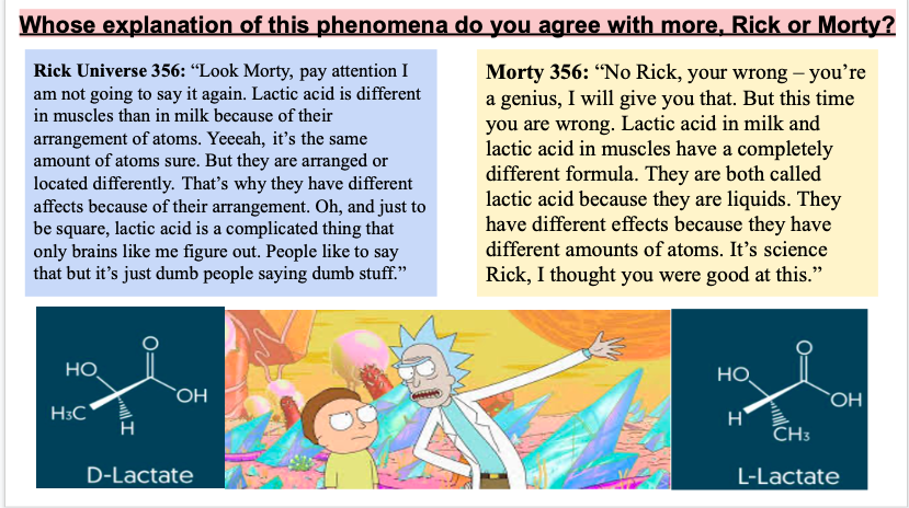 PARAGRAPH STARTER: “The reason why D-lactic acid and L-lactic acid produce different effects despite having the same chemical formula is best described by ________(Rick or Morty). I agree with ______ (Rick or Morty) because... Evidence to support my claim can be seen from my model as... This proves... In conclusion..."