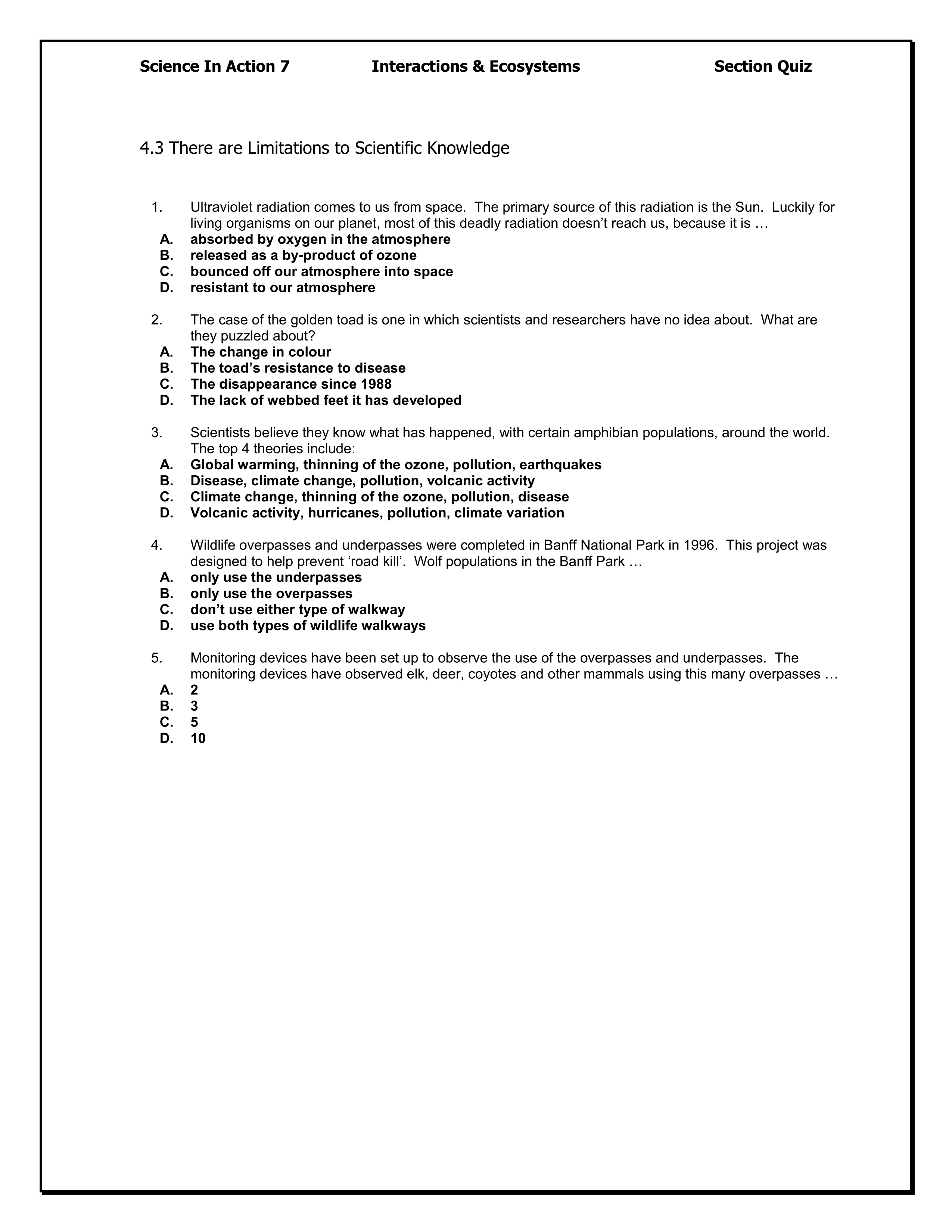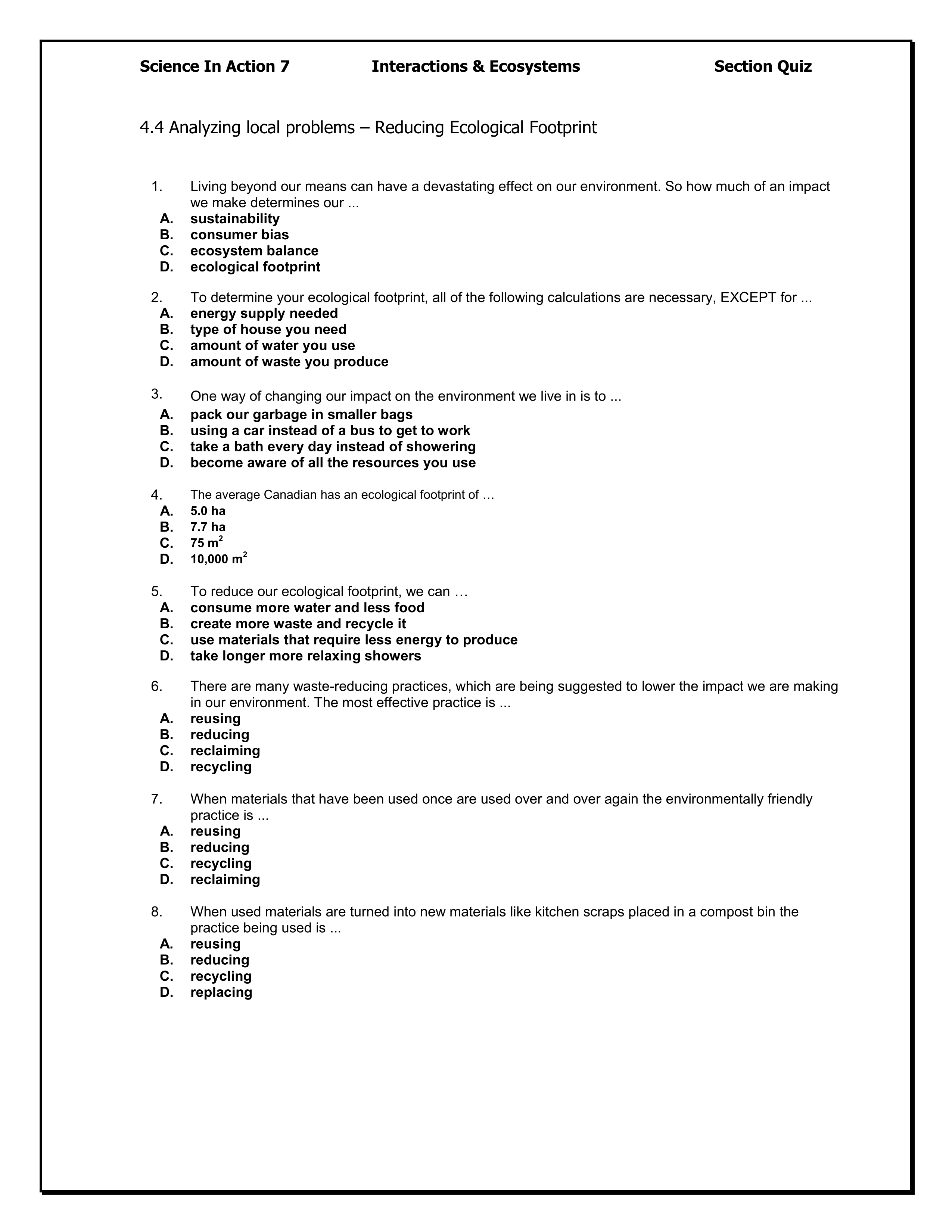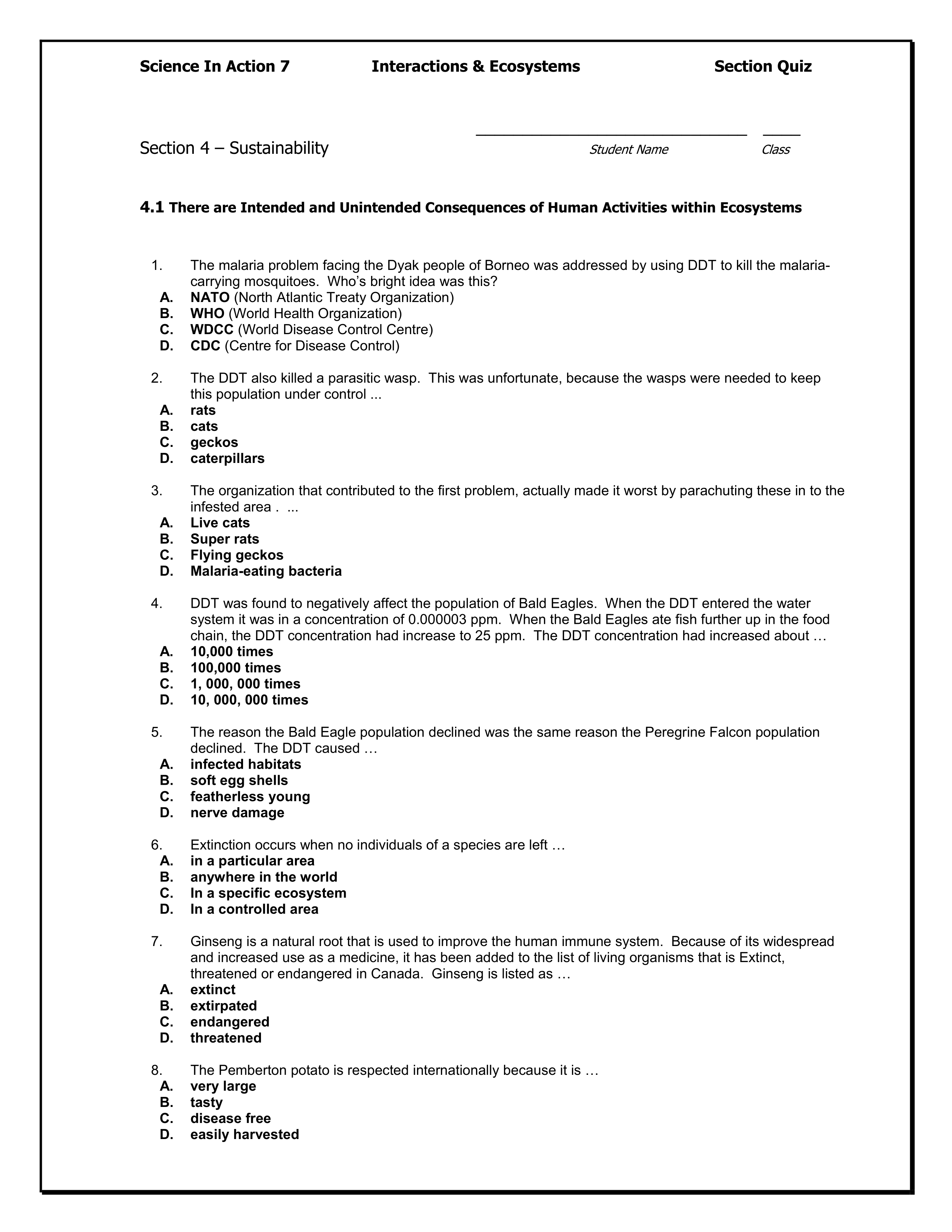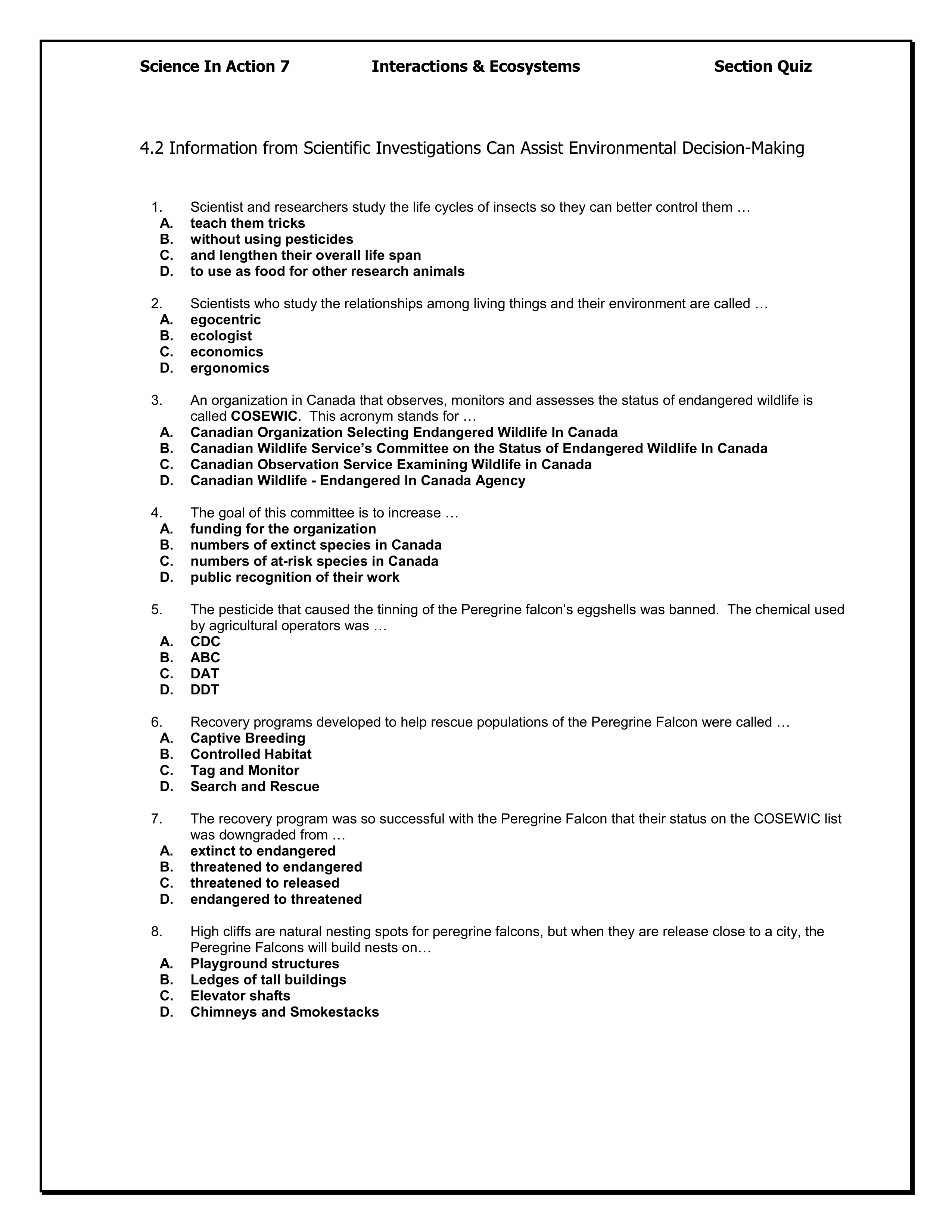 Science 7 Unit A: Interactions and Ecosystems Section 4.0 Quiz