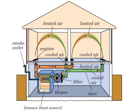 Air that is heated by burning fuel in a furnace and then sent throughout the house through ducts to a register in every room is an example of this type of heating system …