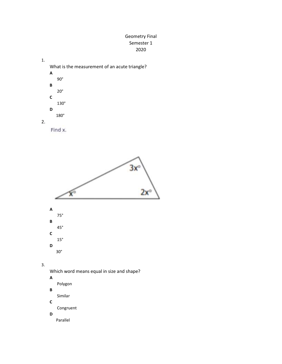 Semester 1 Geometry Final 2020