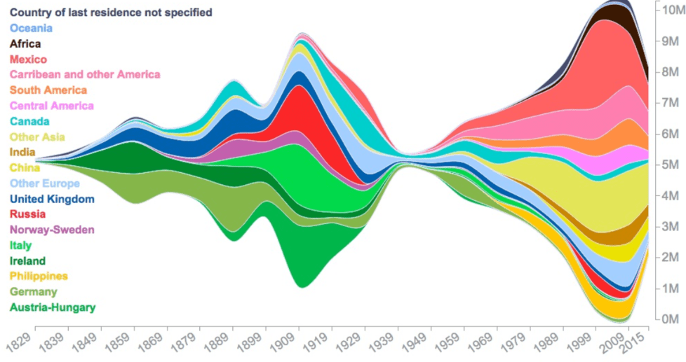 This is a timeline of historical immigration to the US. Find the year 1830. Good! Now identify the majority of people who came to the US between 1830, and 1960. How does the graph identify them (who is orange?)?