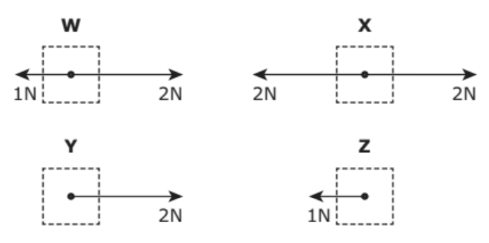 Four objects labeled W, X, Y, and Z have different forces applied to them. All of the horizontal forces acting on each object are shown in the diagrams.