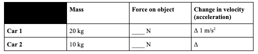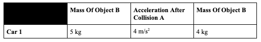 Car 1 and Car 2 crash into each other and cause a collision. The mass and Car 1’s acceleration is listed in the data table below.