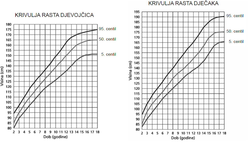 Na slikama su prikazane po tri centilne krivulje rasta za djevojčice i za dječake kojima se prati njihov razvoj.