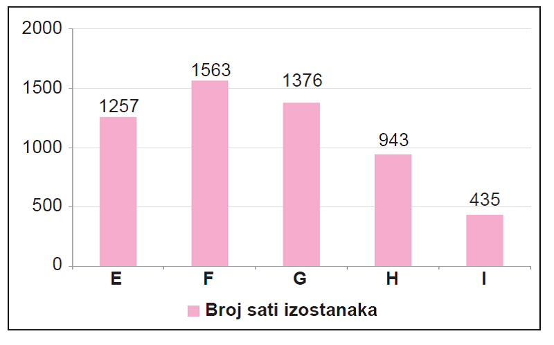 Na grafikonu je prikazan ukupan broj izostanaka u nekoj školi tijekom školskegodine za pet razrednih odjela E, F, G, H i I.
