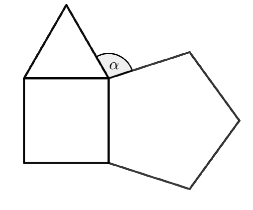Na skici su prikazani jednakostraničan trokut, kvadrat i pravilni peterokut. Kolika je mjera kuta α?