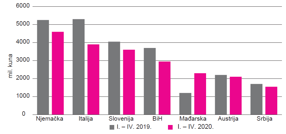 Grafikon prikazuje izvoz roba Republike Hrvatske u milijunima kuna prema vanjskotrgovinskim partnerima u prva četiri mjeseca 2019. i 2020. godine.