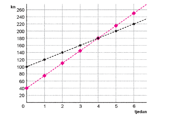 Ema i Lovro istoga su dana otvorili štedni račun. Ema je na svoj račun prvo uplatila 40 kuna i nakon toga je svaki tjedan dodavala po 35 kuna. Grafikon prikazuje iznos novca na Eminu i Lovrinu računu u ovisnosti o broju tjedana štednje.