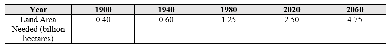 globally. As the world’s population increases and availability of new arable land decreases, providing sufficient food for the world’s human population is becoming increasingly difficult. The table below shows the area of land needed to feed the world’s population from 1900 projected to the year 2060.