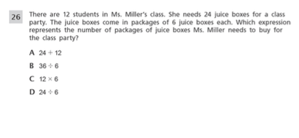 There are 12 students in Ms. Miller's class. She needs 24 juice boxes for a class party. The juice boxes come in packages of 6 juice boxes each. Which expression represents the number of packages of juice boxes Ms. Miller needs to buy for the class party?