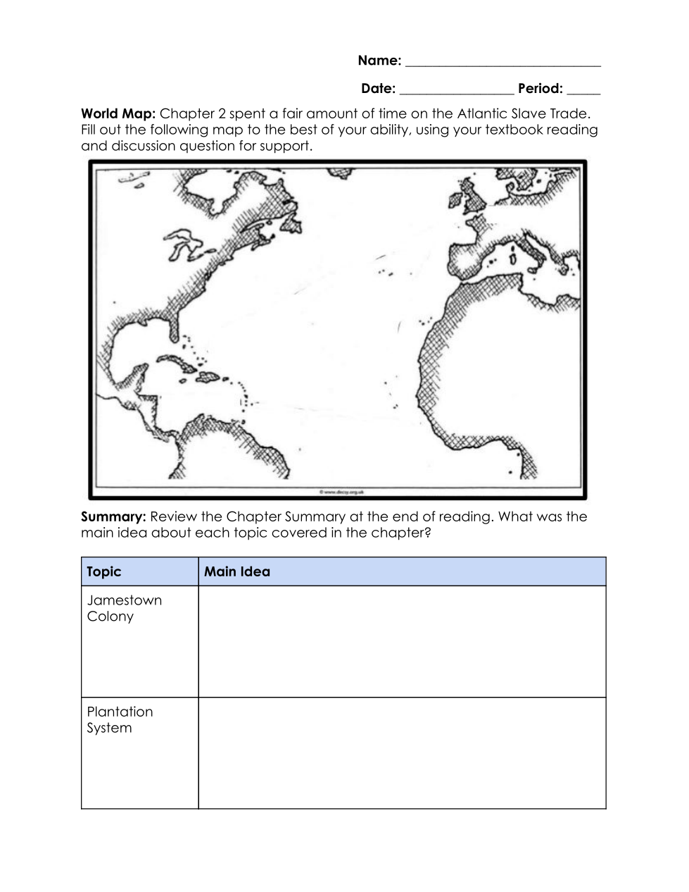 Identify and connect the 3 points that make up the Triangular Trade: Europe, Africa, and the New World.