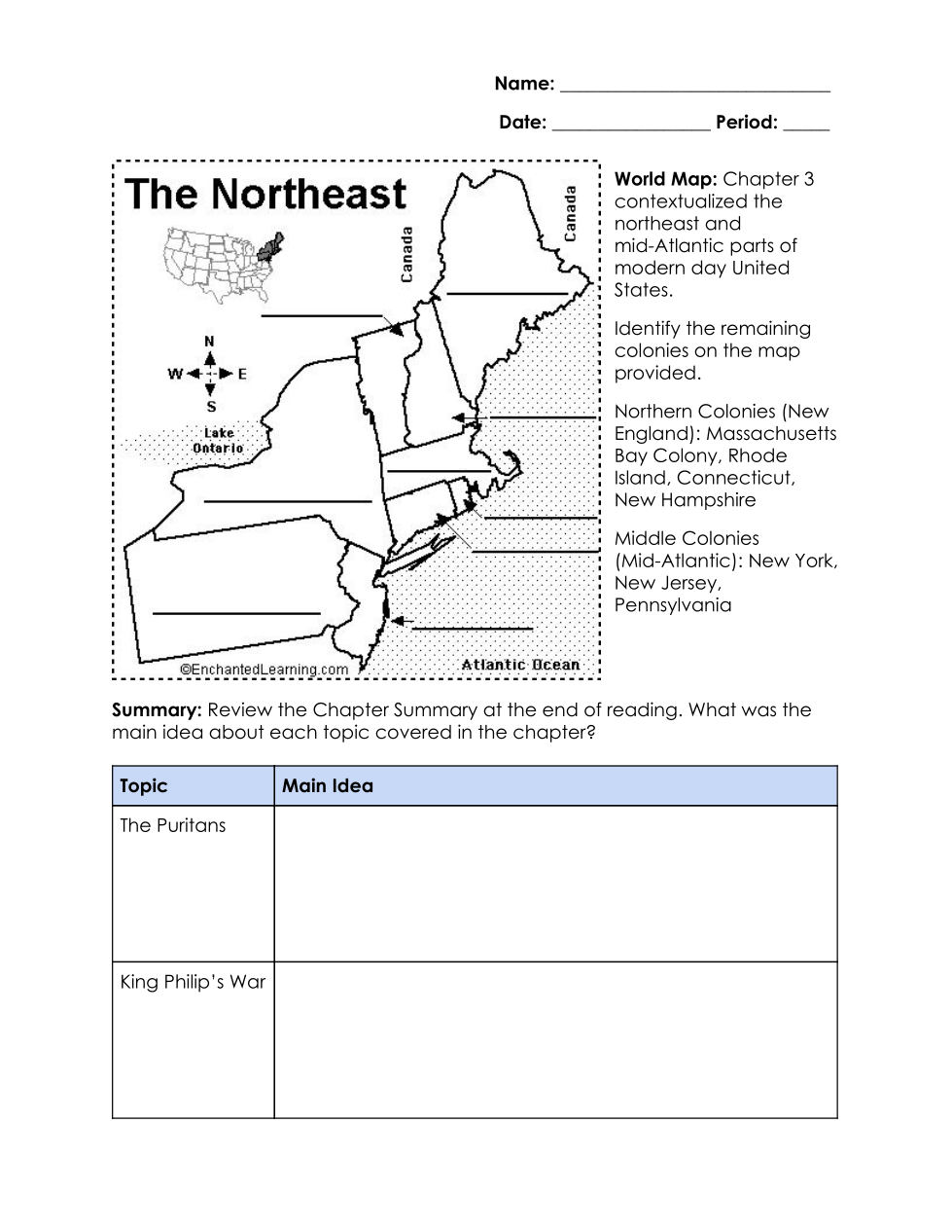 Identify the Northern colonies (a.k.a. New England) and color them in blue.