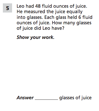 Leo had 48 fluid ounces of juice. He measured the juice equally into glasses. Each glass held 6 fluid ounces of juice. How many glasses of juice did Leo have? Show your work.