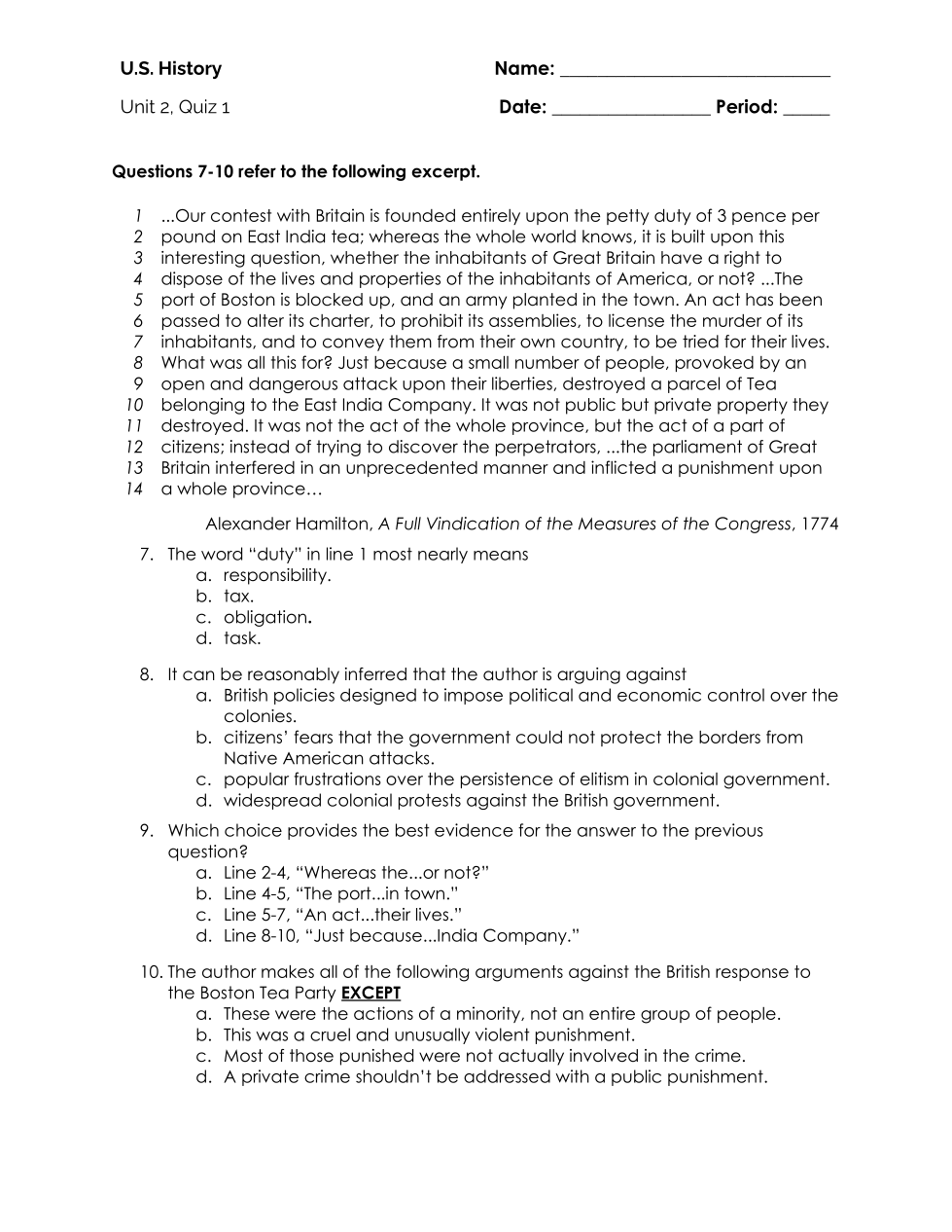 The author makes all of the following arguments against the British response to the Boston Tea Party EXCEPT