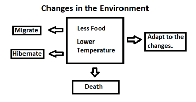 Below is a model that shows how animals might react to changes in the environment. How are bears most likely to respond to changes (less food and lower temperature) in their environment?