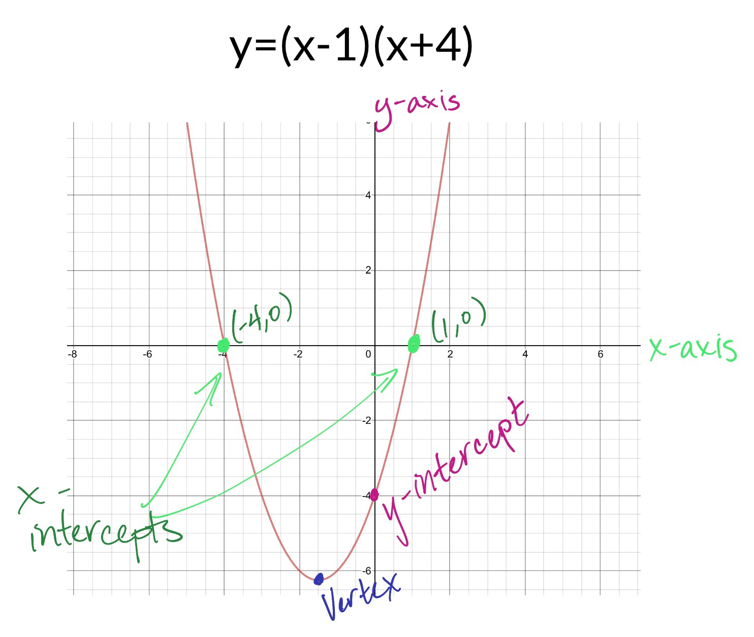 We'll be working today with graphs of quadratics with the end goal of solving quadratic equations (just a heads up, it's almost nothing like solving linear equations). To make sure we all have some common vocabulary, check the picture below. If the picture doesn't make sense to you, watch the video that follows.