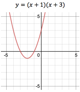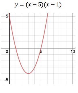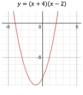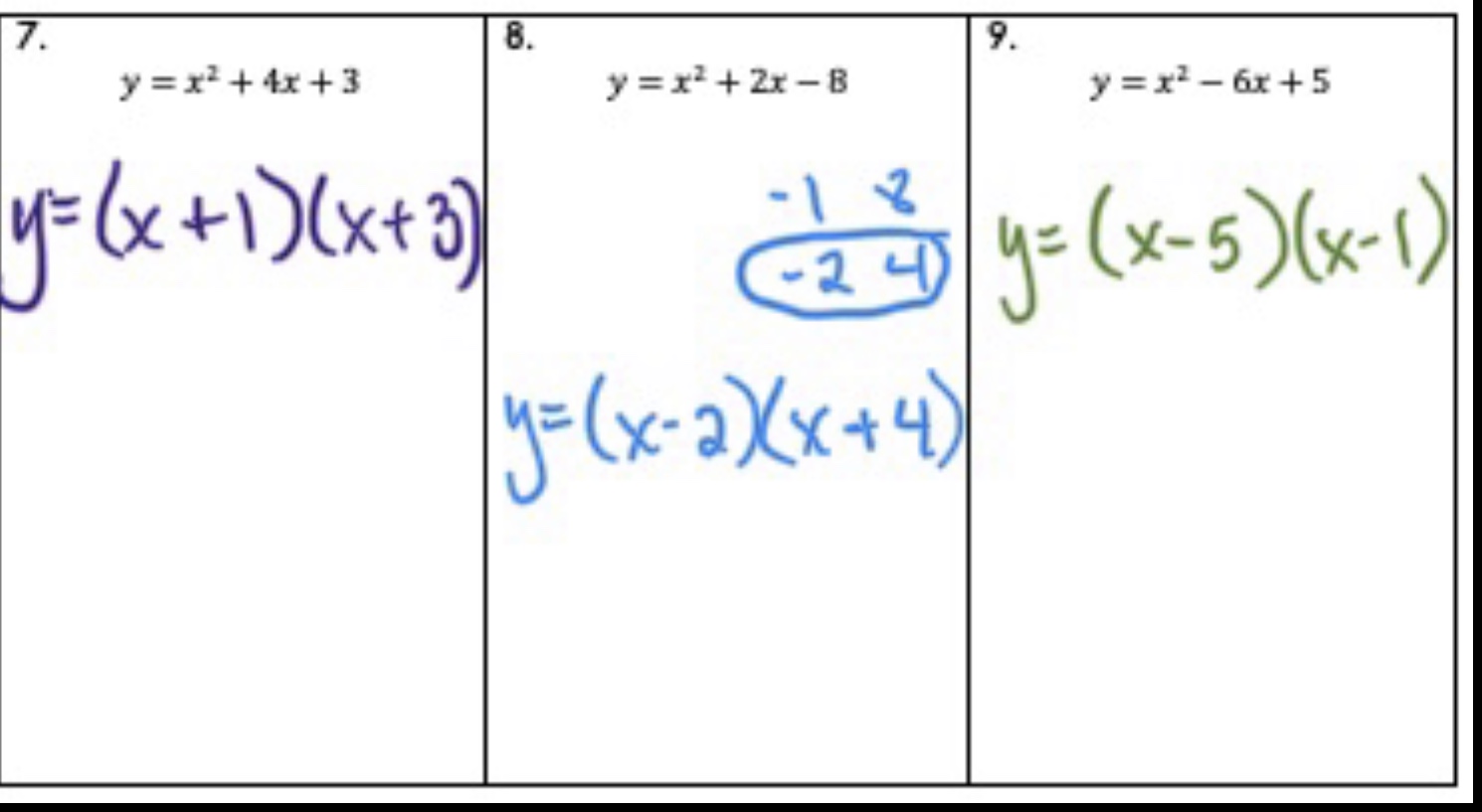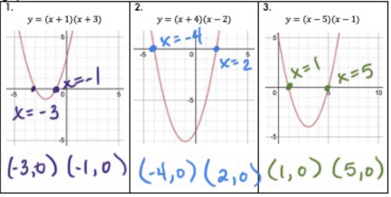 Look through the three images below. The standard form and factored form of each equation is are in the first image, followed by the step where we set each factor equal to zero, then the x-intercepts of each. What pattern do you notice? Think about why it makes sense in the middle row to set the y-value equal to zero.