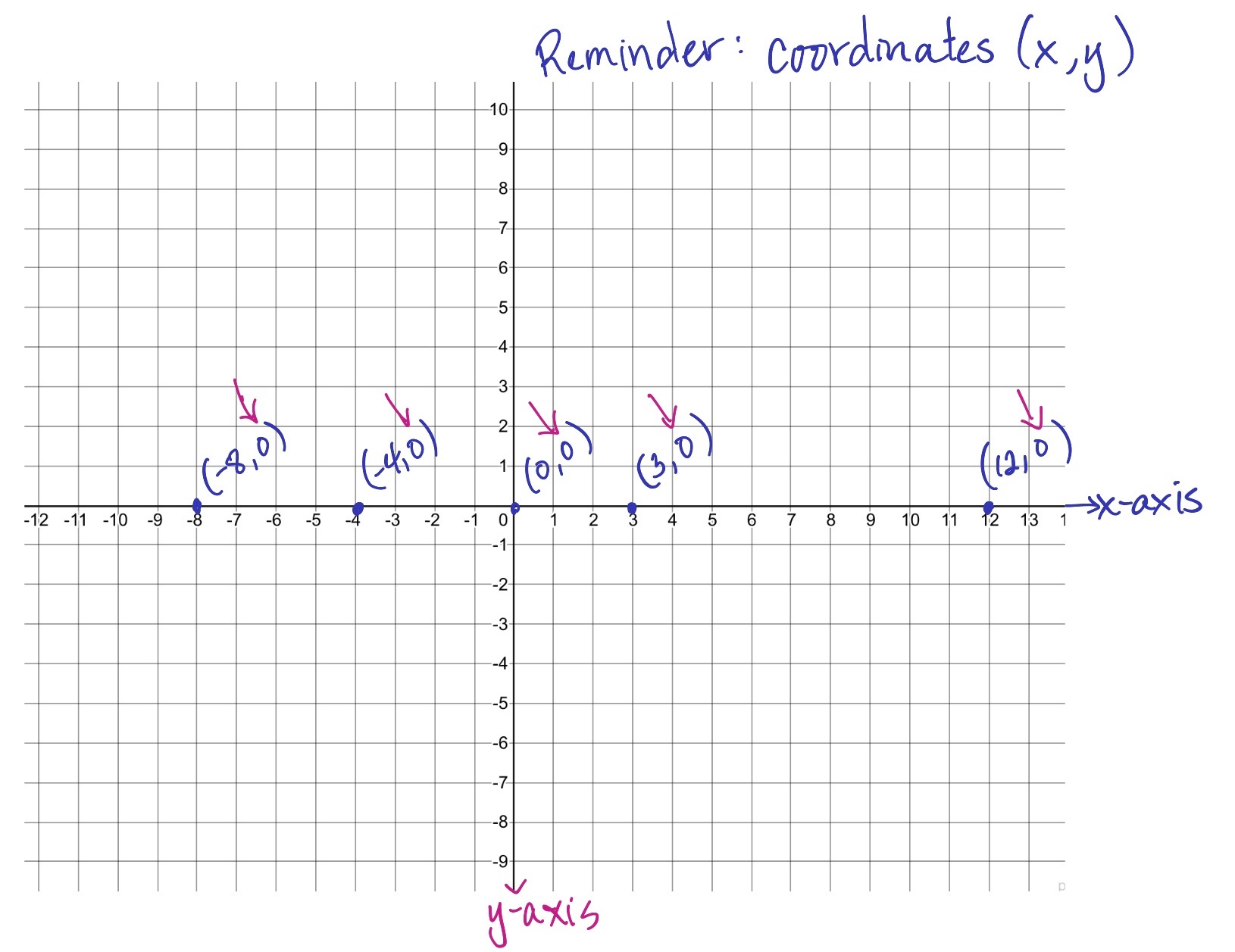 Some coordinates have been added to points that are on the axis. Notice that all of their y-values equal zero. Is it safe to say that any point on the x-axis will have a y-value of zero?