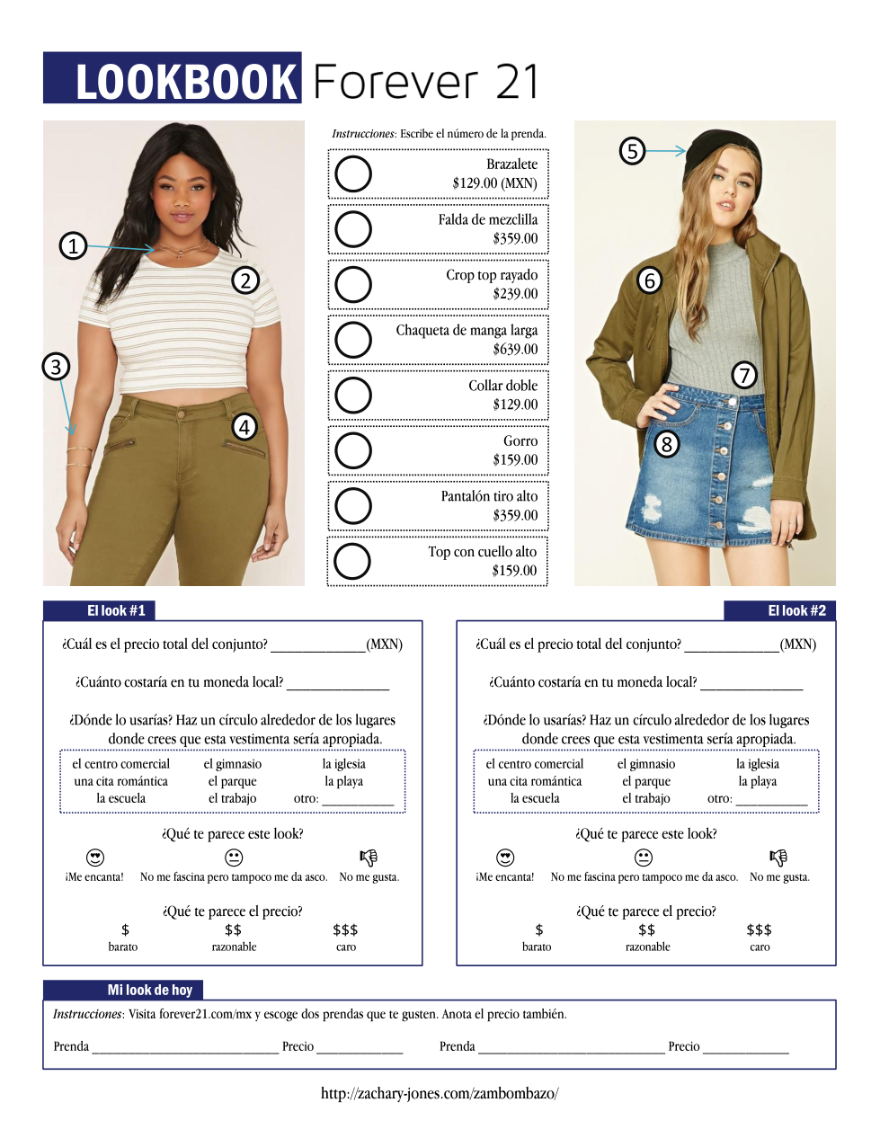 1. Calcula el precio de los conjuntos en pesos mexicanos (that's how it is currently listed). 2. Convierte el precio a dólares estadounidenses www.xe.com3. Indica donde puede llevar el conjunto4. Da (give) tu opinión del conjunto y el precio.