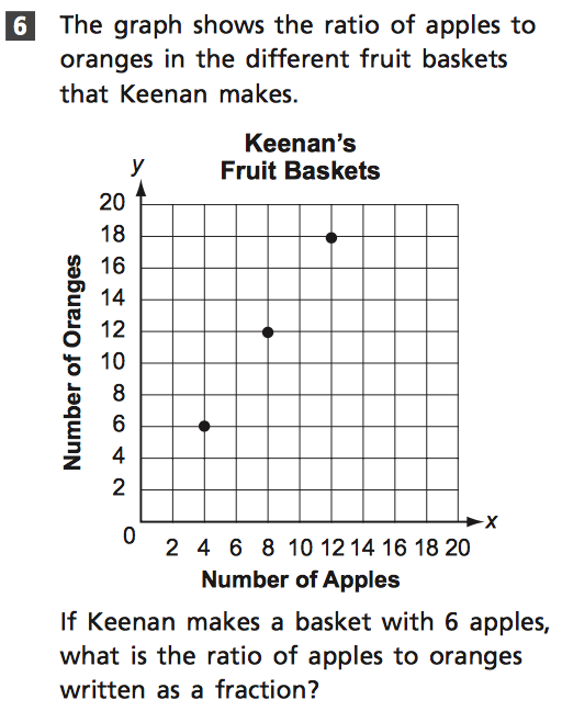 Si Keenan hace una cesta con 6 manzanas, ¿cuál es la proporción de manzanas y naranjas escrita como una fracción?
