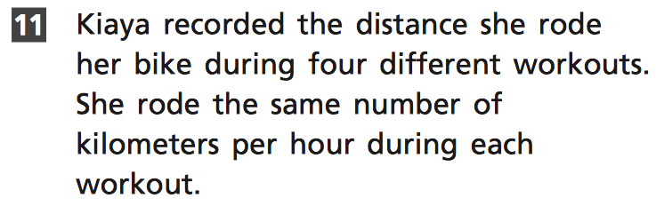 Kiaya registró la distancia que recorrió en bicicleta durante cuatro entrenamientos diferentes. Montó el mismo número de kilómetros por hora durante cada entrenamiento.