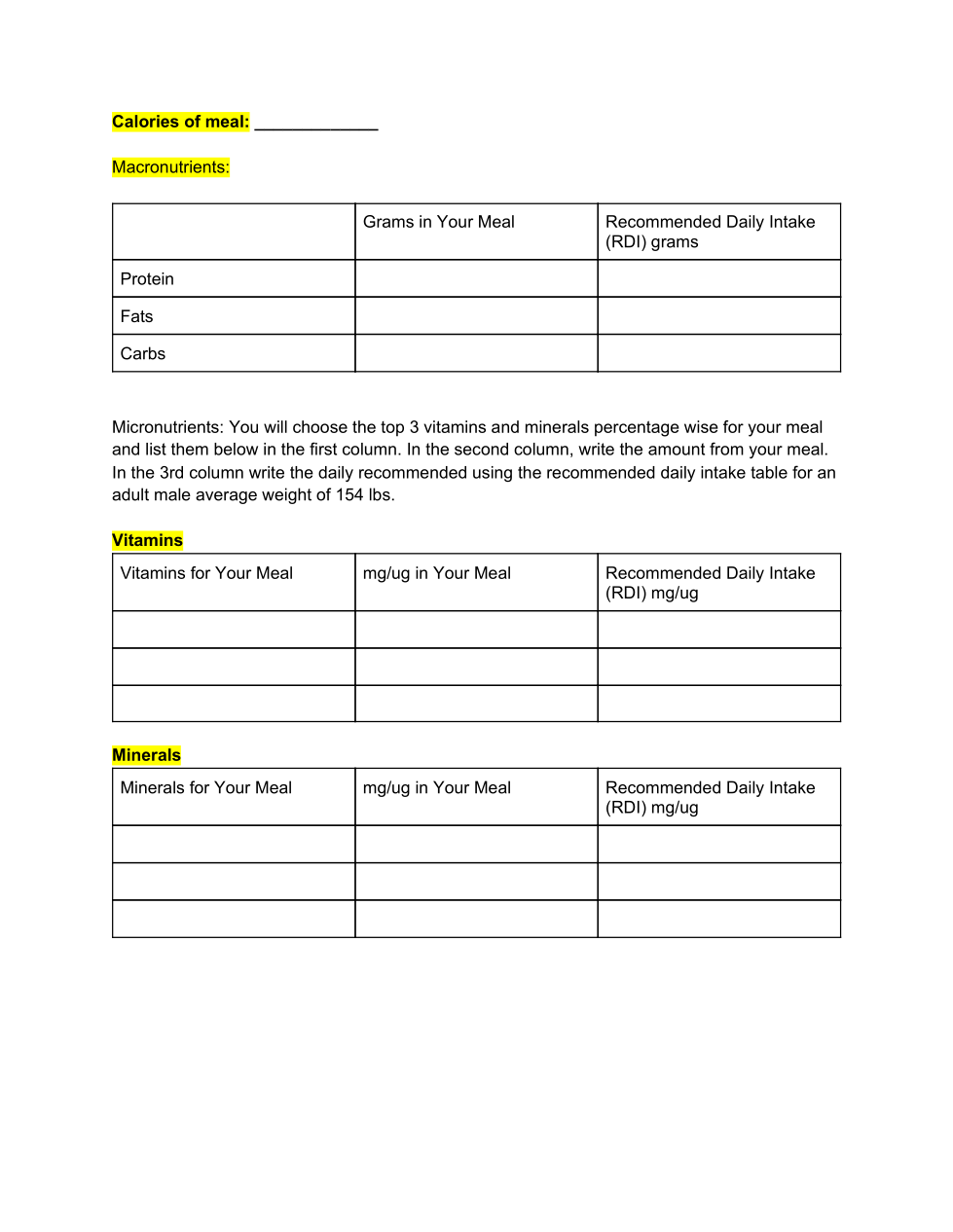 You will list the nutritional breakdown of the following micronutrients and macronutrients of spaghetti. Then you will compare it to the recommended daily intake for an adult male average weight of 154 lbs using the table linked here.