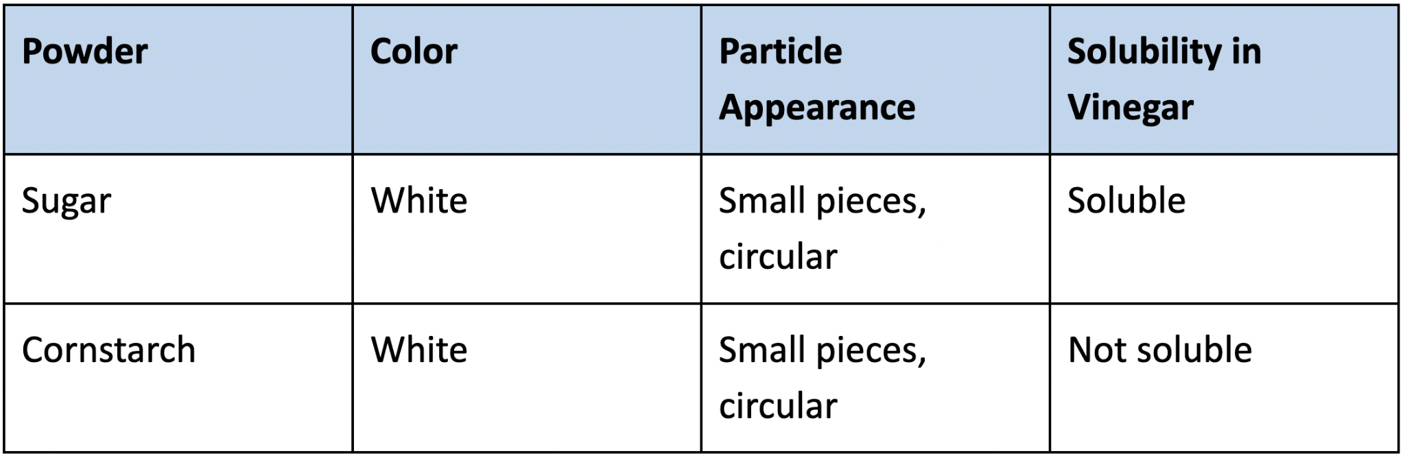 Valerie has two containers with white powders. She knows one is sugar and the other is cornstarch. She needs to figure out which one is sugar. Valerie mixed both substances with vinegar. Her observations are below.