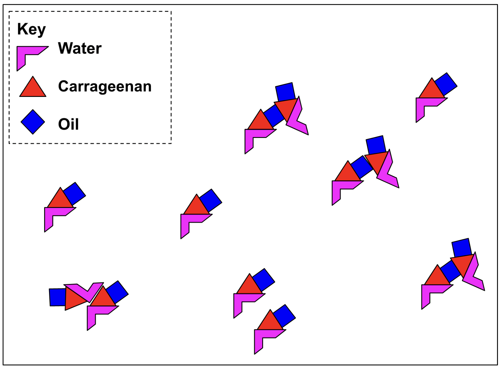 Which of the following statements about the water, oil and Carrageenan molecules are true? Select ALL that apply. (4 pts)