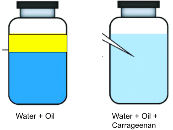 For her next experiment, Valerie mixed together water and oil and noticed it separated into layers. Then she added Carrageenan to the mixture and stirs, the water and oil stayed mixed. To the right is a diagram of the two jars.