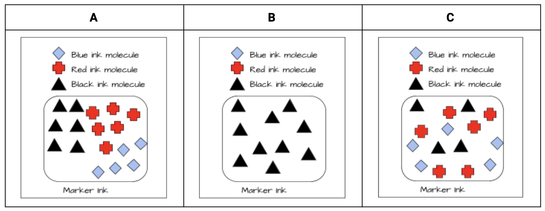 Fabian created 3 different models of the molecules in the marker ink before the experiment. Which model is the most accurate (correct)? (2 pts)