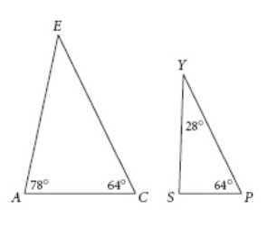 AA Similarity conjecture | arrow_right_alt | If two corresponding angles of one triangle are congruent to two corresponding angles of another triangle, then the two triangles are similar. |