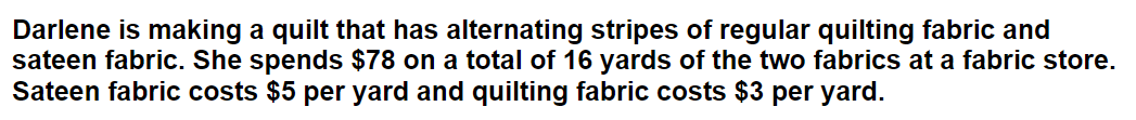 Write to equations to determine how much of each fabric Darlene bought.