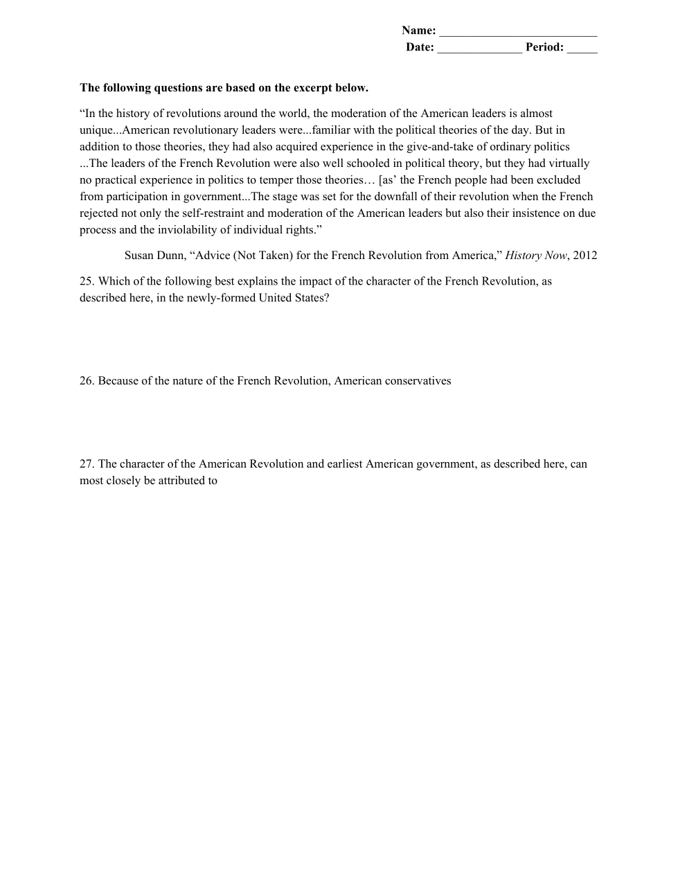 Which of the following best explains the impact of the character of the French Revolution, as described here, in the newly-formed United States?