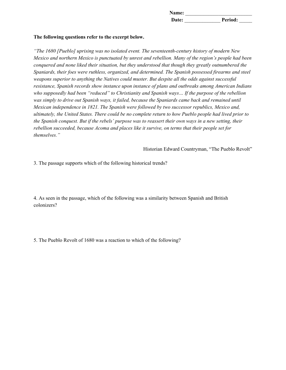 The Pueblo Revolt of 1680 was a reaction to which of the following?