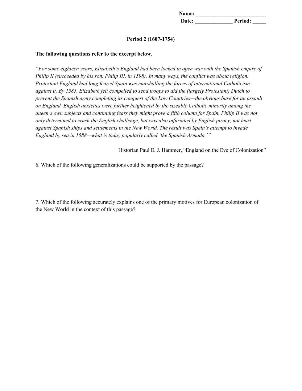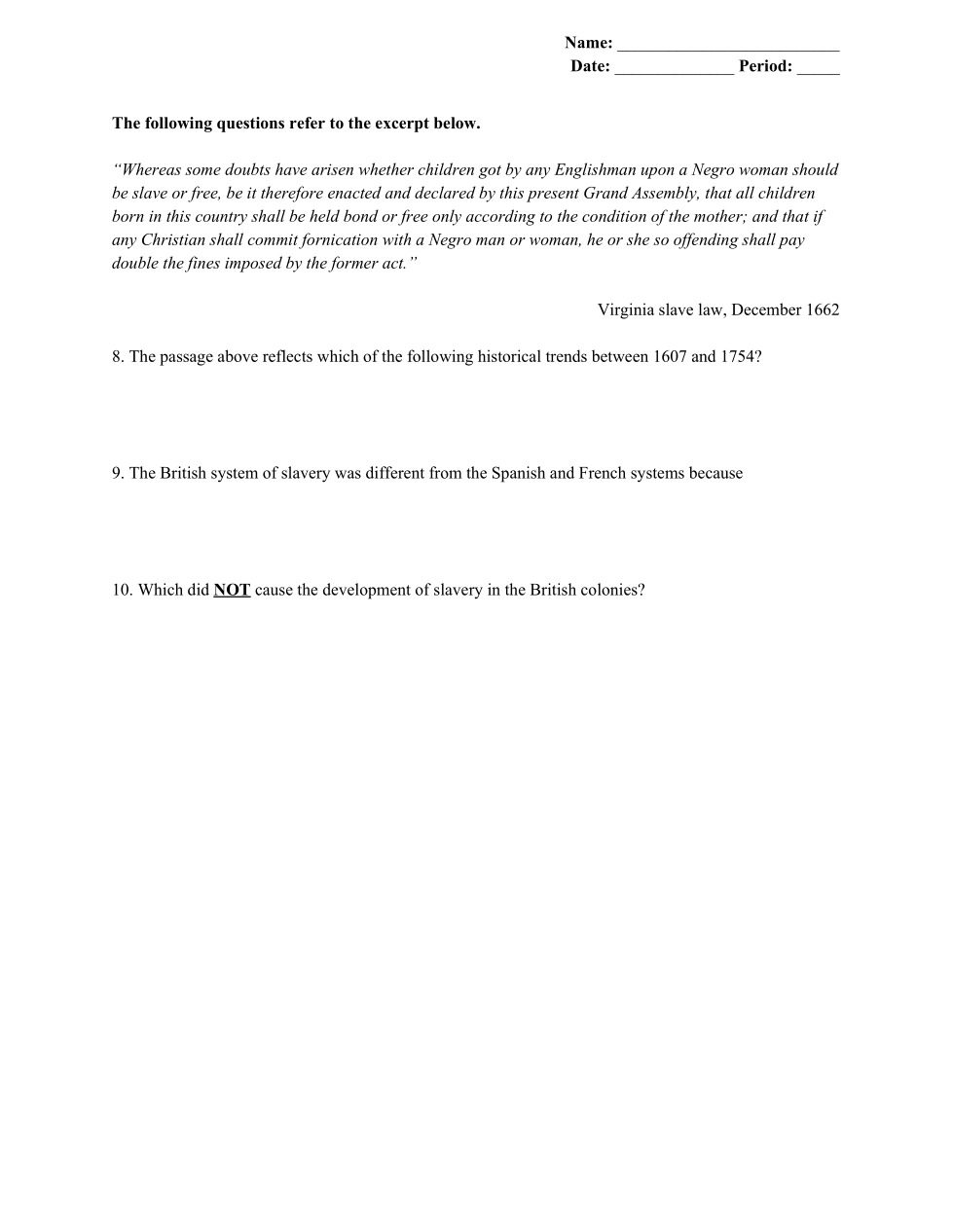 The passage above reflects which of the following historical trends between 1607 and 1754?