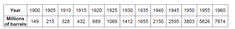 Here is a record of annual world crude oil production from 1900 to 1960 in five year increments