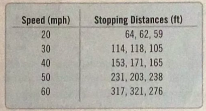 The following table shows the stopping distances in feet for a car tested 3 times at each of 5 speeds. We hope to create a model that predicts the stopping distance from the speed of the car.