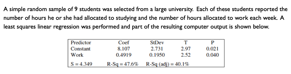 A plot of the data and the computer output from fitting a least squares regression line to the data are shown below.