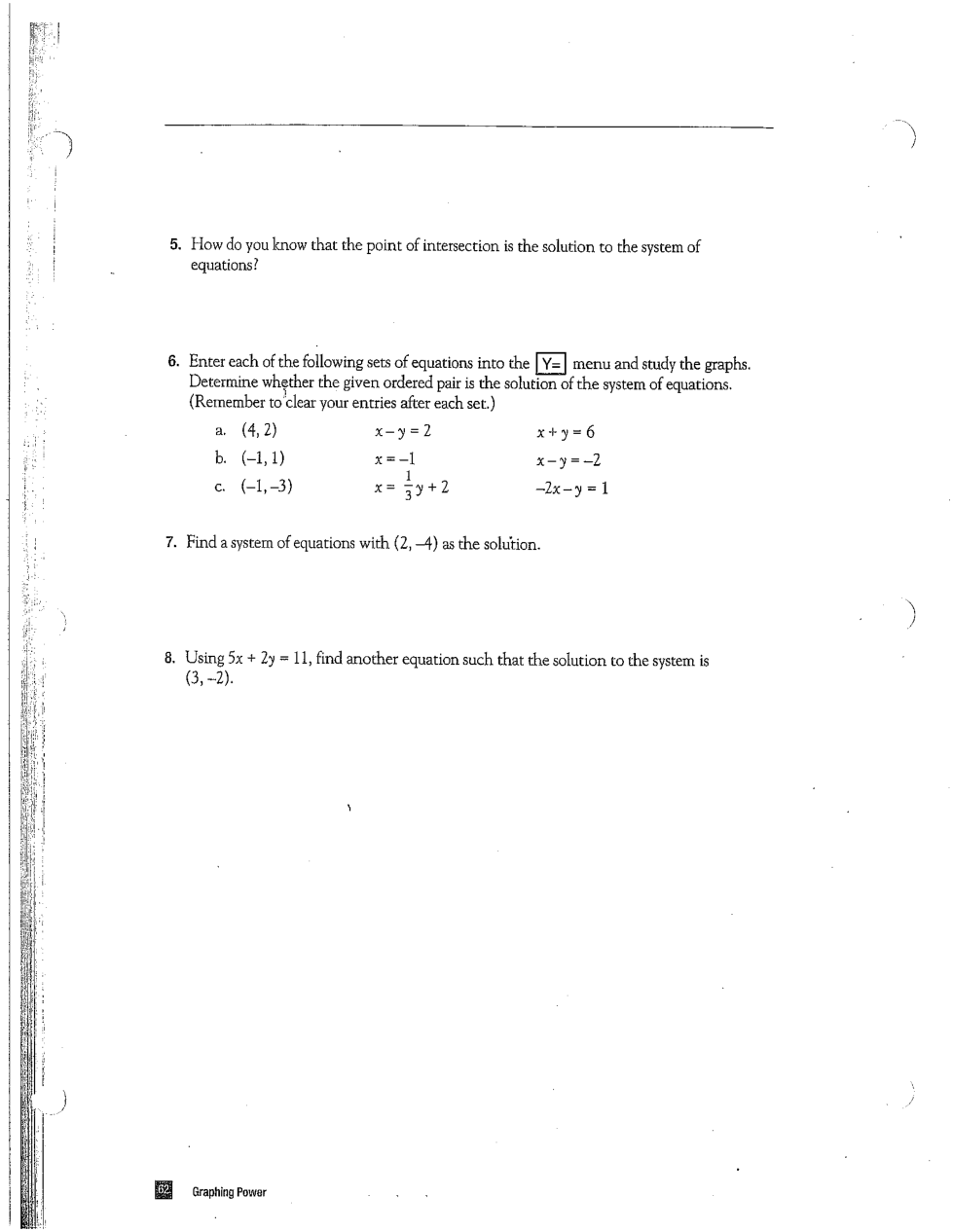 Using 5x+2y=11, find another equation such that the solution to the system is (3, -2).