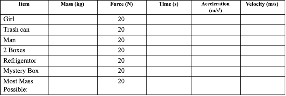 Now use 2 boxes totaling 100 kg and repeat what you did for the previous data table increasing the force by 100 N each time. Fill in the data table below.