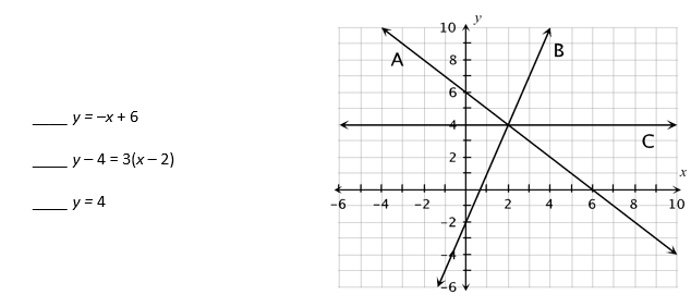 Match each equation with line A, B, or C from the graph: (1 point each)