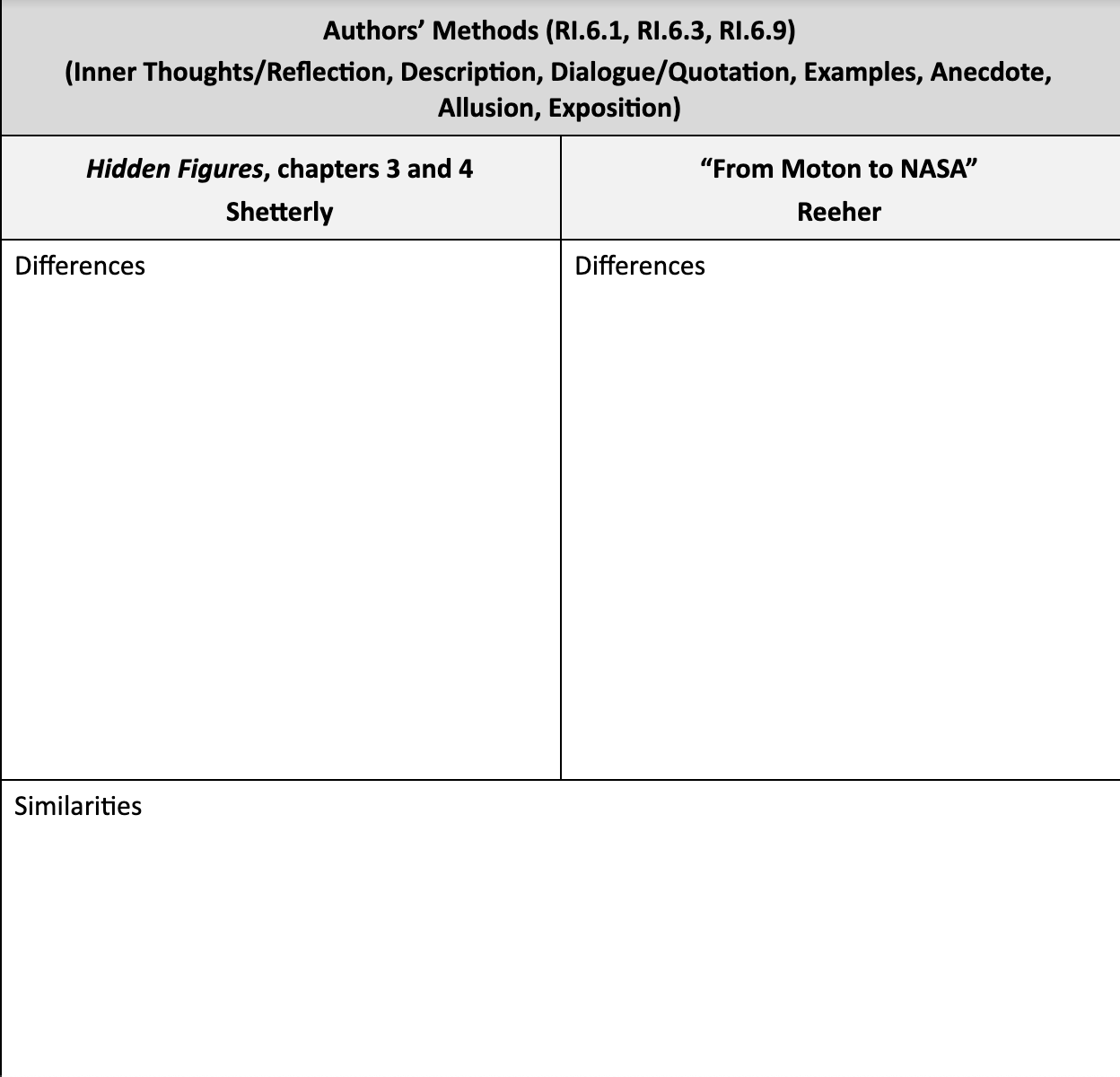 Example: The Moton passage uses QUOTATIONS from people who knew Dorothy well to paint a picture of her personal character, while Hidden Figures uses more DESCRIPTIONS from a third-person perspective.