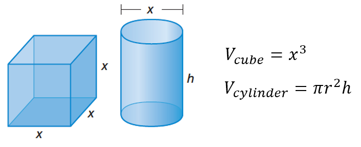 A cube and a cylinder are to have the same volume. The diameter x of the cylinder is equal to the length of the edge of the cube. What must be the height of the cylinder, in terms of x?