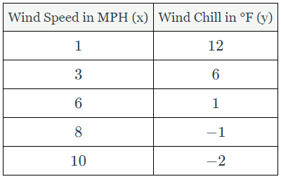 The accompanying table shows wind speed and the corresponding wind chill factor when the air temperature is 14°F. Write a logarithmic regression equation for this set of data, rounding all coefficients to the nearest ten-thousandth.