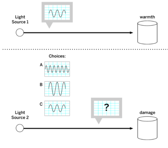 Examine the diagram below. Observe the waveform and effect for Light Source 1, and the effect for Light Source 2. Then, decide which waveform (A, B, or C) could represent the light emitted by Light Source 2. Consider the following questions to help you decide: