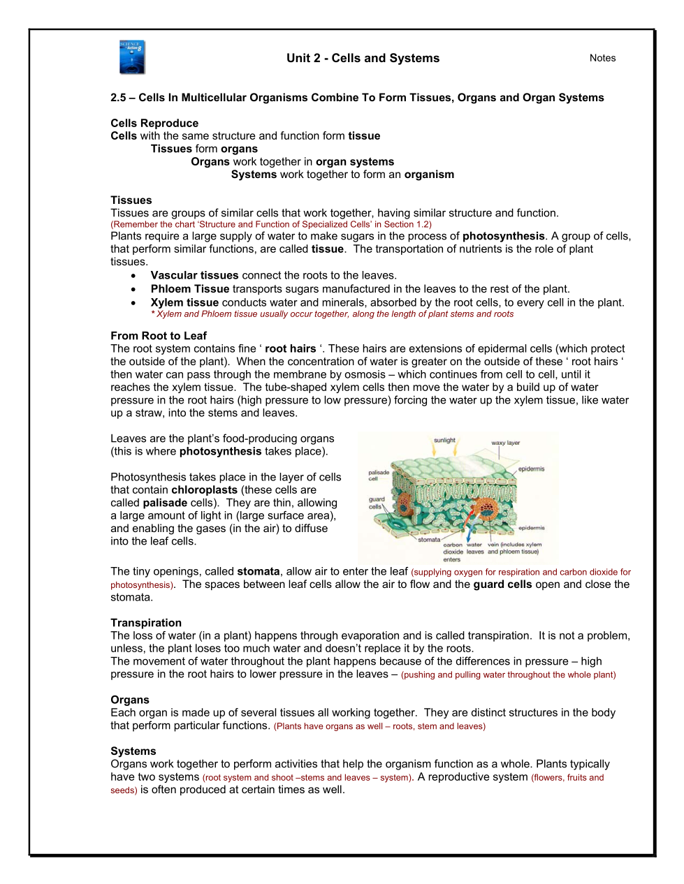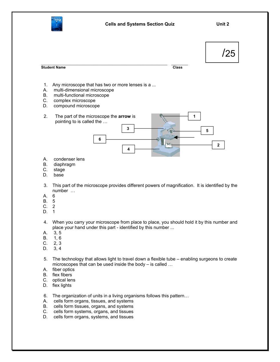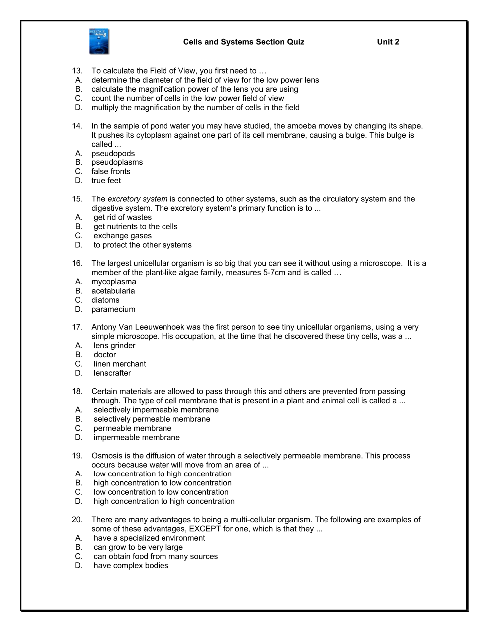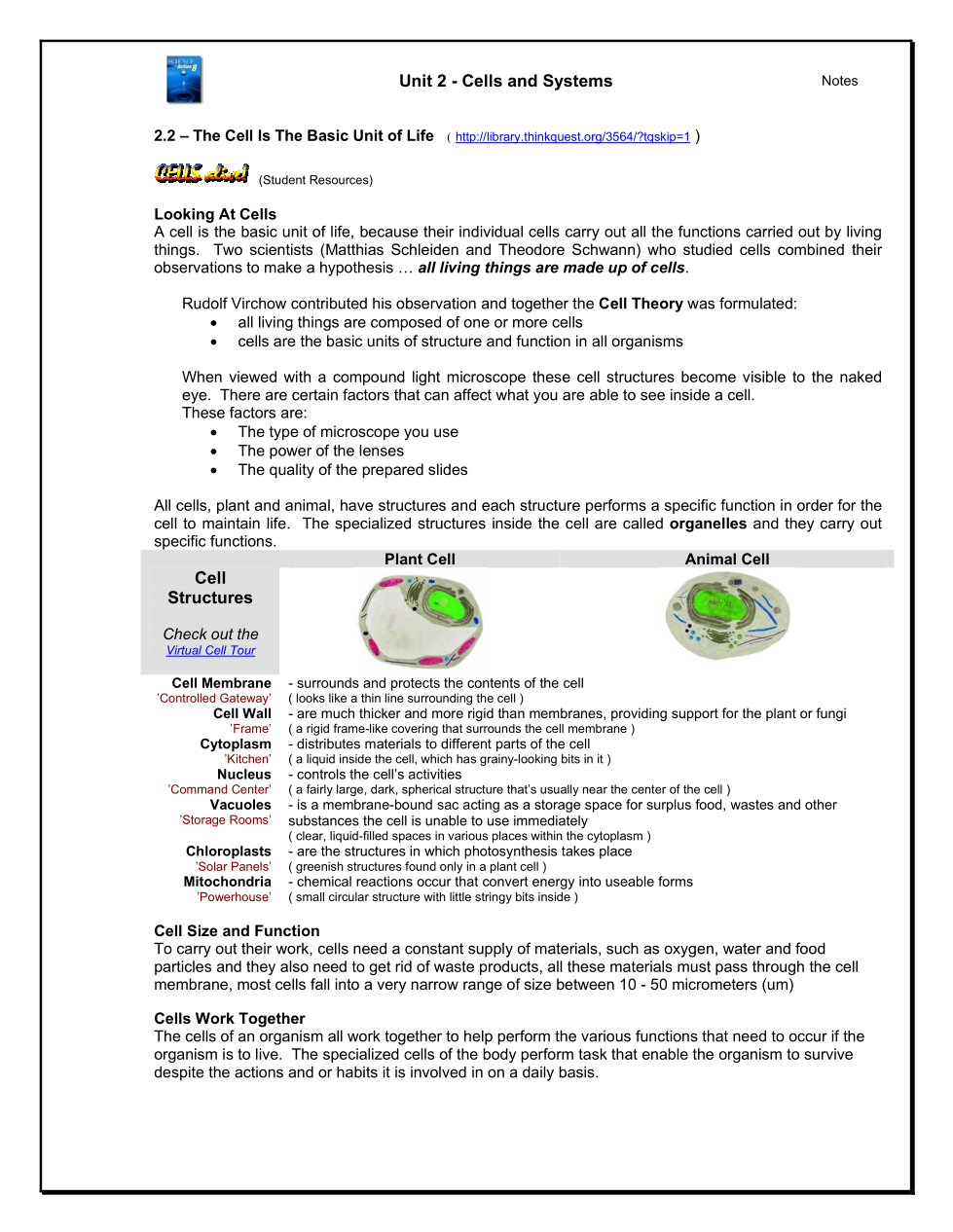 Sci. 8: Cells & Systems -Section 2.0 Quiz